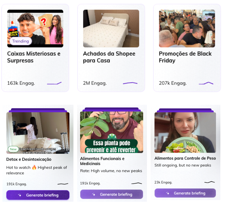 Briefings são documentos estratégicos e acionáveis, gerados automaticamente a partir das trends. Eles oferecem uma visão ampliada de uma trend, incluindo diferentes ângulos para explorar a oportunidade, criadores de conteúdo de destaque dentro daquele território e outros insights relevantes, agilizando o processo de informar e engajar outras equipes e parceiros em oportunidades culturais interessantes.