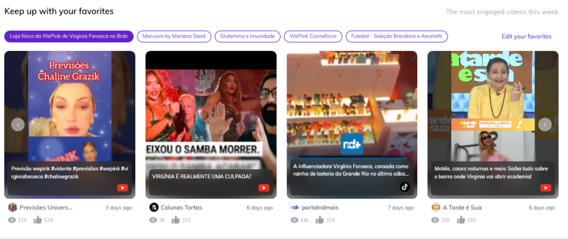 Clique no ícone de estrela no lado esquerdo do nome do Tópico ou Subtópico. Ao fixá-lo, a plataforma irá automaticamente trazer à tona os vídeos mais relevantes e com maior buzz daquele território, exibindo-os diretamente na sua aba Início.