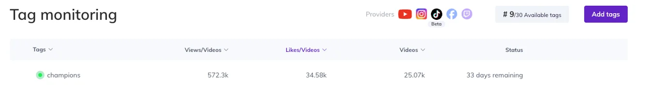 O monitor de tags é um recurso da aba da marca que ajuda você a acompanhar múltiplas campanhas e hashtags.