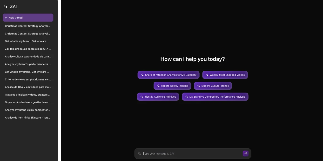 O ZAI é o Agente de Inteligência Cultural proprietário da Winnin, criado para guiá-lo pelo cenário competitivo da Economia da Atenção. Ele entrega insights acionáveis, oferecendo uma vantagem estratégica na corrida por relevância e participação de mercado.
